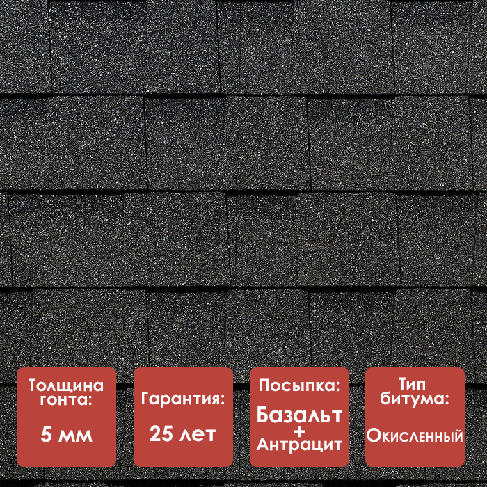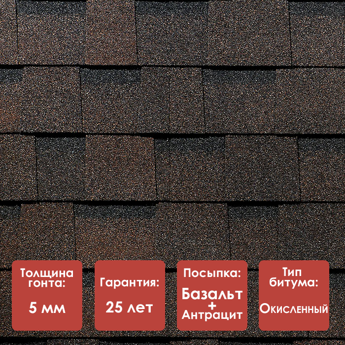 Основой материала служит стеклохолст, пропитанный окисленным битумом. Верхняя поверхность покрыта окрашенным гранулятом из базальта и антрацита, который прикатан к битуму и выполняет защитную и декоративную функции. Посыпка защищает кровлю от ультрафиолета, осадков и механических воздействий, сохраняя стабильность цвета.